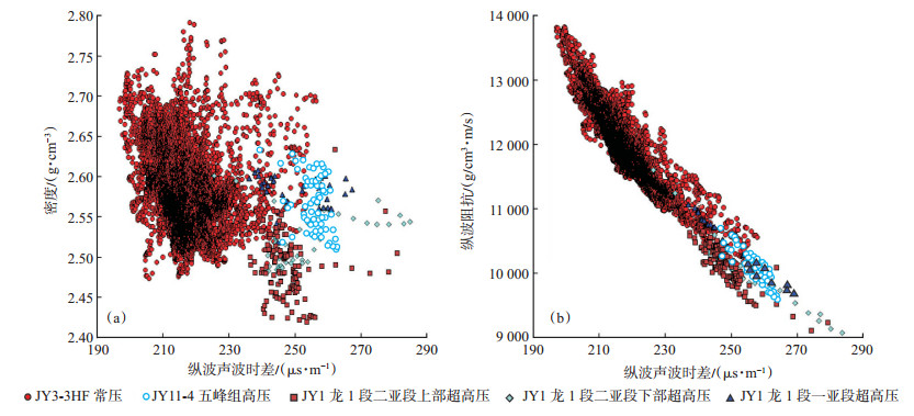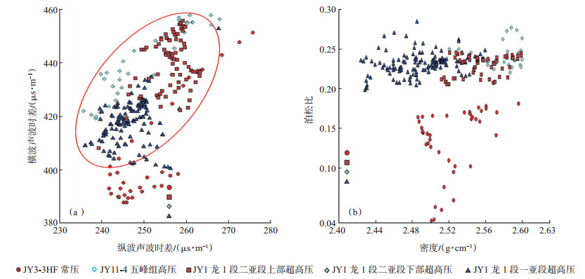 下载eps/tif图 图 2 高压和超高压段横波声波时差与纵波声波时差(a)、泊松比与密度(b)交会图 Fig. 2 Cross plots of S-wave acoustic transit time and P-wave acoustic transit time (a), Poisson' s ratio and density (b) in overpressure and ultra-high pressure zones |