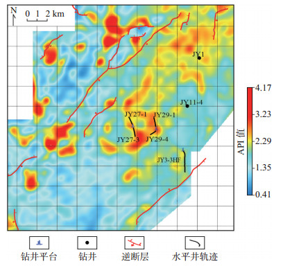 研究中通过叠前弹性波阻抗反演分别计算出纵波阻抗和泊松比数据体,结合式(1),即可求得研究区的异常压力识别因子数据体。对该数据体沿龙马溪组底界选取合适时窗,对龙马溪组一段一亚段的异常压力识别因子进行平面图绘制(图 3)。