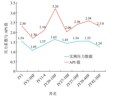 如图 3所示,预测出的异常超压区主要分布在研究区的中部和东北部。本次研究收集了部分钻井龙马溪组一段一亚段的实测压力系数值,进一步将异常压力识别因子API的数值与实测地层压力值进行对比(表 2)。