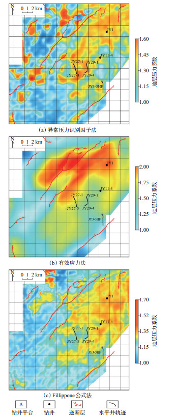为对比不同地层压力预测方法预测结果的准确性,将研究中采用的新方法异常压力识别因子法与传统的Fillippone公式法、基于波阻抗反演计算有效应力的地层压力预测方法(以下简称有效应力法)的预测结果进行对比(图 6)。其中,有效应力法的参数选取,根据三轴应力实验及钻井实钻参数确定,具体计算公式见文献[27-28]。