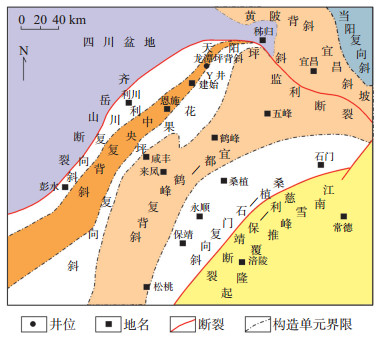 本次研究的Y井位于花果坪复向斜—中央复背斜过渡带北东段(图 1)。早期东西向的龙潭坪背斜由于受后期北东—北北东向构造改造,褶皱西端与北东向褶皱的过渡带在Y井西侧呈“S”型展布,总体处于龙潭坪背斜南翼西段。