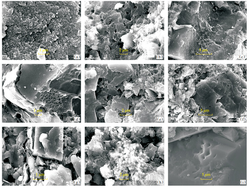 下载eps/tif图 图 2 Y井大隆组页岩孔隙发育特征 (a)有机质孔,0.035~0.271 μm,694.4 m;(b)有机质孔,0.170~1.331 1 μm,711.1 m;(c)有机质孔,0.179~0.691 μm,717.0 m;(d)矿物溶蚀孔和有机质内孔,0.243~1.648 μm,704.2 m;(e)矿物溶蚀孔,0.067~0.943 μm,714.8 m;(f)矿物溶蚀孔,0.250~1.399 μm,714.8 m;(g)矿物溶蚀孔,0.239~2.738 μm,704.2 m;(h)有机质,矿物溶蚀孔和黄铁矿晶间孔,0.122~2.276 μm,720.4 m;(i)黄铁矿粒内孔,0.260~1.380 μm,722.1 m Fig. 2 Porosity evolution of shales of Dalong Formation in well Y |