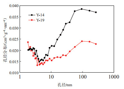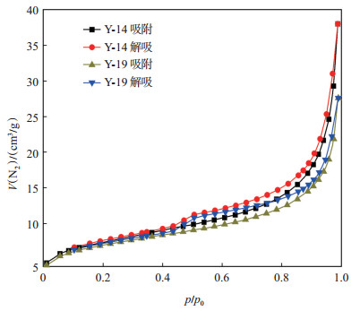 为表征页岩样品的微观孔隙,采用Autosorb-iQ全自动比表面和孔径分布分析仪对大隆组页岩样品进行低温N2吸附脱附实验。图 3为研究区大隆组Y-14(采自711.1 m)和Y-19(采自722.1 m)2块页岩样品的氮气吸附脱附等温曲线。