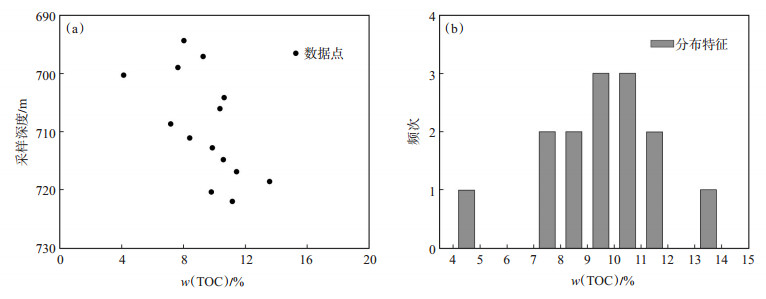 TOC是烃源岩丰度评价的重要指标,可近似代表岩石原始有机质丰度。大隆组黑色页岩TOC质量分数为1.62%~13.6%,平均值为8.76%,随采样深度呈缓慢增加趋势[图 5(a)]。TOC质量分数大于4%的样品占样品总数的100%,主要为7%~ 12%[图 5(b)],表明研究区大隆组页岩有机质丰度高,具有形成页岩气的良好物质基础。
