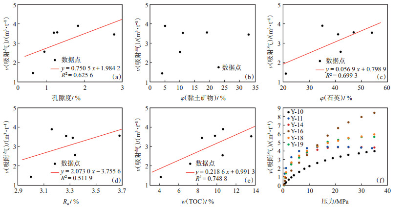 由前述研究可知大隆组优质页岩储层具有特低孔隙度的特征,但孔隙度与吸附气含量之间存在明显的正相关关系[图 6(a)],页岩吸附气含量随孔隙度的增加而增大。大隆组黑色页岩以含炭泥岩和含炭粉砂质泥岩为主,石英含量较高,储层脆性指数较大,有利于产生微裂缝,含气量与石英含量之间呈弱的正相关关系[图 6(c)],而与黏土矿物含量相关性不明显[图 6(b)]。崔楠等[35]认为石英的硬度大,孔隙结构在长期的构造运动中可以完好保存,而黏土矿物因剧烈的构造挤压导致孔隙结构被破坏,降低了对页岩气的吸附能力。[图 6(d)]显示页岩Ro与吸附气含量的总体相关性较小,呈弱的正相关关系,与张木辰等[34]的报道相似,有机质成熟度的提高促进有机组分纳米级孔隙的产生,从而增加页岩气的储集空间[36],但程鹏等[37]指出成熟度过大可能不利于页岩气的富集。谭淋耘等[38]报道页岩有机质含量是页岩气成藏最重要的控制因素,决定着页岩生气的物质基础。大隆组页岩实测TOC含量与含气量呈明显的正相关关系,吸附气含量随着有机碳含量的增加而增大,拟合系数0.748 8,表明有机碳含量对页岩气藏影响显著[图 6(e)]。在温度一定的情况下,页岩气吸附气量随着压力的增加而增大[图 6(f)]。因此,较高的TOC含量为大隆组页岩生气提供了物质基础,储层孔隙度为页岩气的富集提供了存储空间,两者均是建始地区大隆组页岩气富集的有利因素,且较高的脆性矿物含量为页岩气的开采压裂提供了有利条件。另外,大隆组页岩厚度为44.07 m,埋深在700 m左右,属于中浅层埋深,有利于页岩气的保存与开采。大隆组页岩上覆地层为大冶组的泥质岩和碳酸盐岩,下伏地层为二叠系下窑组灰岩等,岩性较致密,封盖性较好,各层系的孔隙率和渗透率均较低,具有优越的顶板和底板封闭条件,有利于该区页岩气的保存。