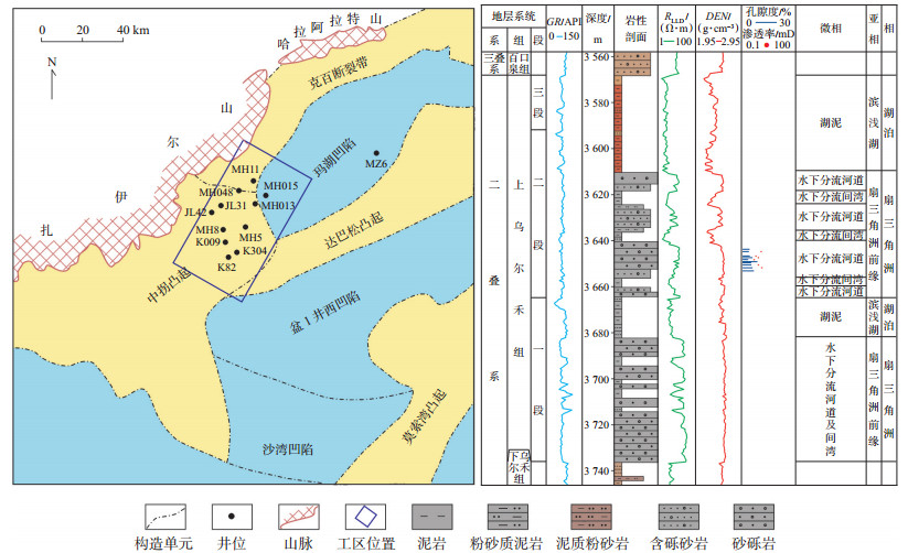 1 区域构造及沉积特征中拐—玛南地区构造位置处于准噶尔盆地西北缘,其东北部为克百断裂带,南部为中拐凸起,东部为玛湖凹陷、盆1井西凹陷和达巴松凸起(图 1)。基本表现为南东倾的单斜,局部发育宽缓平台和鼻状构造,断裂较少[18-20]。研究区内自下而上钻遇石炭系,二叠系佳木河组、风城组、夏子街组、下乌尔禾组和上乌尔禾组,三叠系百口泉组、克拉玛依组和白碱滩组,侏罗系八道湾组、三工河组、西山窑组、头屯河组和白垩系。各层系之间为不整合接触。目的层二叠系上乌尔禾组以近物源粗碎屑扇三角洲砂砾岩沉积为主,平面上可划分为扇三角洲平原、扇三角洲前缘和滨浅湖3个亚相。自下而上可细分为3段,乌一段(P3 w1)、乌二段(P3 w2)和乌三段(P3 w3),乌一段厚约80~120 m,乌二段厚约60~ 100 m,乌三段厚约30~80 m,由西北向东南沉积厚度逐渐增大。区域沉积研究表明,中拐—玛南地区上乌尔禾组为湖进沉积体系域,砂体为退积叠置式发育样式[21-23],主要储层为扇三角洲前缘亚相水下分流河道灰色、灰绿色砂砾岩(图 1)。