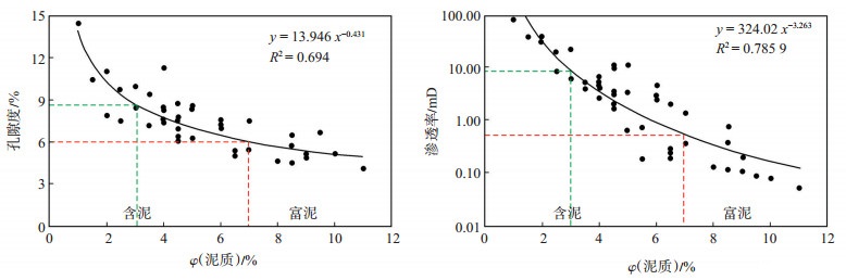 将准噶尔盆地中拐—玛南地区23口井、44个样品点的泥质含量与孔隙度、渗透率分别交会拟合(图 2),参考提交储量数据,将泥质体积分数小于7%定义为含泥砂砾岩,大于7%定义为富泥砂砾岩,当泥质体积分数从7%降到3%,渗透率从0.55 mD升到9 mD,孔隙度从6%升到8.7%,由此可知,上乌尔禾组储层渗透率对泥质含量的变化更为敏感,当泥质体积分数大于7%时,渗透率小于0.55 mD,高泥质含量使喉道分割成微细喉道,平均孔喉半径减小,束缚水增多,渗流能力明显降低,从而阻滞油气渗流,储层产能很低,基本属于低效或者无效储层。当泥质体积分数小于7%时,渗透率大于0.55 mD,孔隙结构好,储层产能高,为优质高效储层。因此,泥质体积分数7%可以作为区分有效储层与非有效储层的界限。