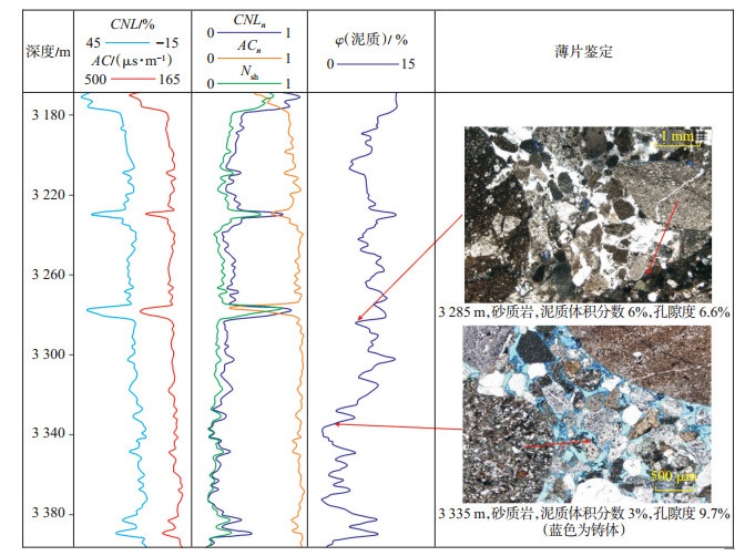 式中:CNL为储层补偿中子孔隙度测井值,%;AC为声波时差测井值,μs/m;CNLn与ACn分别表示去量纲归一化后的中子孔隙度值与声波时差测井值;Nsh为泥质含量评价因子。