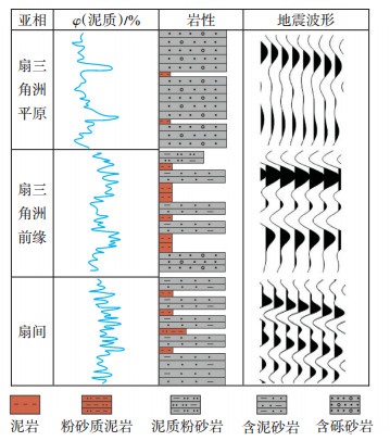 根据反演井所处的沉积特征,分析不同沉积相带岩性组合的波形特征:①扇三角洲平原亚相以厚层状砂砾岩为主,夹薄层状泥岩,地震波形反射特征为顶界面中强振幅、高频特征,底界面为中低频、中弱振幅,中间为低频弱反射;②扇三角洲前缘亚相多以互层状砂砾岩、泥岩为主,地震反射波形特征为顶界强反射,底界中强反射,反射界面之间为中低频弱反射;③扇间为薄互层状泥岩、砂岩、含砾砂岩,地震波形反射特征为中强振幅,中低频,复波特征(图 6)。