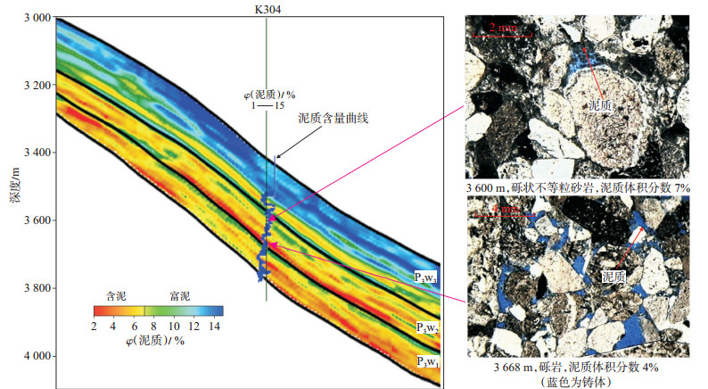4.4 结果分析利用泥质含量曲线经过地震波形指示反演得到泥质含量反演数据体,图 7为过K304井的泥质含量反演剖面,含泥砂砾岩位于上乌尔禾组中下部,上部主要为富含泥质的砂砾岩及泥岩,横向上泥质含量变化自然,通过与镜下薄片鉴定数据对比,井深3 600 m处样品镜下鉴定泥质体积分数为7%,反演结果为7.2%;井深3 668 m处样品镜下鉴定泥质体积分数为4%,反演结果为4.15%。从对比结果来看,泥质含量反演数据真实可靠。