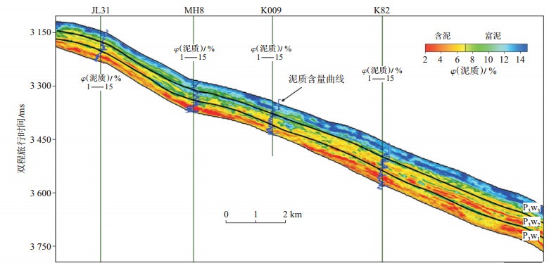 从泥质含量地震反演连井剖面可以看出井与井之间对比关系好(图 8),通过验证井K009井泥质含量曲线与反演的泥质含量剖面对比,结果吻合率高。砂砾岩泥质含量边界清晰,井间泥质含量变化自然,上乌尔禾组一段和二段泥质含量较低,上乌尔禾组三段泥质含量较高,符合研究区的地质特点,地震反演泥质含量分辨率也较高。利用地震波形指示反演泥质含量提高了地震识别优质储层的精度和可靠性。