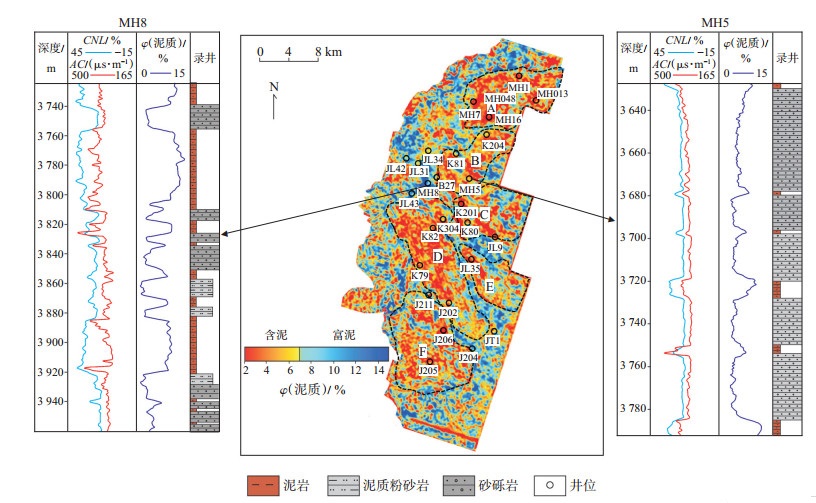 综合以上认识,利用砂砾岩泥质体积分数7%的门槛值对平面泥质含量数据进行分类,得出上乌尔禾组有利储层的分布范围(图 9)。通过位于扇三角洲前缘水下分流间湾的验证井(MH8井)与扇三角洲前缘水下分流河道的验证井(MH5井)泥质含量与平面泥质含量预测结果对比,反演结果与沉积认识以及已钻井泥质含量一致性高,反演结果吻合率达85%以上,最终确定上乌尔禾组有利勘探区6个,总面积为450 km2,为后期井位部署和储量提交提供了有力支撑。