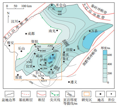 1 样品与方法四川盆地位于上扬子板块的西北部,是长期发育于特提斯构造域内的古生代-中新生代海陆相复杂含油气盆地[22]。震旦纪以来,四川盆地经过多期构造作用的改造,北部由大巴山和米仓山环绕,东部发育湘黔鄂冲断带,南部与峨眉山-大凉山冲断带相邻,西部由龙门山环绕[23]。受加里东晚期构造抬升的影响,研究区地层剥蚀严重,在乐山-龙女寺古隆起核部奥陶系已被剥蚀殆尽[24]。晚奥陶世开始在盆地中西部形成川中隆起,早志留世造山作用强烈,盆地发育局限陆棚环境,在川中和川南广大范围内缺失志留系[25]。研究区位于四川盆地南部,勘探面积为8.8万km2,包括长宁、威远、宜宾、泸州和永川等地区(图 1)。目的层位五峰组-龙马溪组页岩发育黑色炭质页岩,短粗笔石较发育,见块状黄铁矿,分布范围较广,厚度较大,埋藏深度为2 490~4 500 m,是页岩气勘探开发的有利层位。