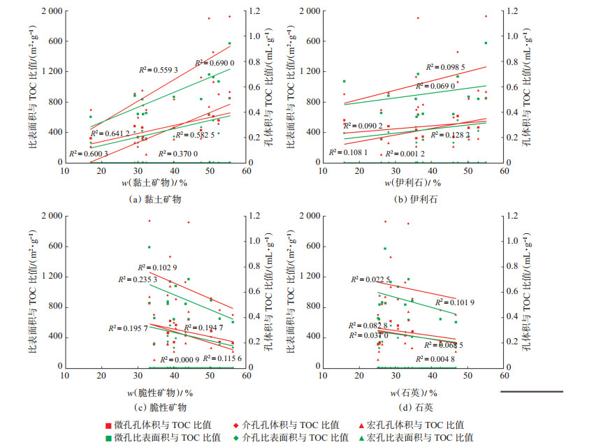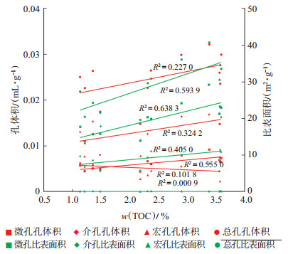 在埋藏成岩过程中,有机质是控制页岩吸附性能的主要内在因素[39],有机碳含量越高,气体吸附量越大,表明TOC含量对页岩孔隙发育贡献较大[40-41]。图 9中页岩TOC含量与微孔孔体积和比表面积具有较好的正相关关系(相关系数分别为0.555 0和0.638 3),与介孔孔体积和比表面积相关性较差,与宏孔相关性不明显,表明富有机质页岩对微孔和介孔孔体积的发育贡献较大,而对宏孔的贡献较小。TOC含量对页岩总孔体积和比表面积均具有一定的控制作用。