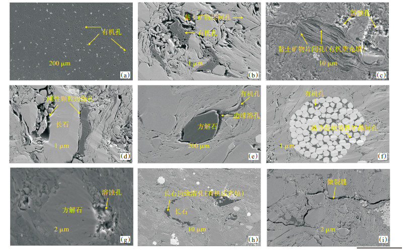 下载eps/tif图 图 2 川南地区五峰组—龙马溪组页岩微观特征 (a)黑色页岩,有机孔(蜂窝状)较发育,2 490.50 m,N213井,龙马溪组,FE-SEM;(b)黑色页岩,黏土矿物层间孔较发育,4 355.38 m,Z201井,龙马溪组,FE-SEM;(c)黑色页岩,黏土矿物压实变形,有机质与黏土边缘收缩缝较发育,4 327.30 m,L202井,五峰组,FESEM;(d)黑色页岩,长石颗粒边缘孔,4 355.38 m,Z201井,龙马溪组,FE-SEM;(e)黑色页岩,方解石颗粒边缘孔,4 355.38 m,Z201井,龙马溪组,FE-SEM;(f)黑色页岩,草莓状黄铁矿晶间孔(部分被有机质充填),3 872.50 m,Z202井,龙马溪组,FE-SEM;(g)黑色页岩,方解石边缘溶蚀孔,3 872.50 m,Z202井,龙马溪组,FE-SEM;(h)黑色页岩,长石边缘溶孔,3 795.00 m,L204井,龙马溪组,FE-SEM;(i)黑色页岩,构造微裂缝,3 795.00 m,L204井,龙马溪组,FE-SEM Fig. 2 Microscopic features of Wufeng-Longmaxi Formation shale in southern Sichuan Basin |