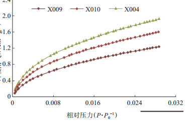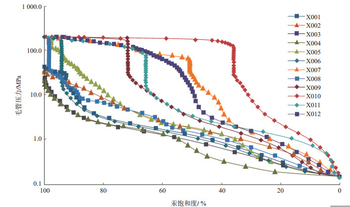 当非润湿相的汞在注入页岩岩样时,由于需要克服一定的毛管压力,不同压力下孔径的分布特征存在差异,采用Washburn方程可以得到每一进汞压力对应的孔隙半径,因此不同孔径条件下进汞量的大小可以反映孔隙体积特征,而岩石界面张力大小可以改变带电电荷和可电离表面电解液之间的接触角,根据Young-Dupré方程计算接触角,进而得到页岩各个孔径的比表面积[31-32]。从图 3可看出,毛管压力曲线整体居中分布,中间主进汞段较平缓,最大进汞压力为209.2 MPa。样品孔隙可分为2种类型,第1种类型以X007,X009,X010,X011和X012页岩样品为代表,在低压段进汞量较大,说明页岩孔隙连通性较好,孔喉直径较大。第2种类型以X001,X002,X003,X004,X005,X006和X008页岩样品为代表,在高压段进汞量较大,表明页岩孔喉直径范围较小,孔隙连通性较差。
