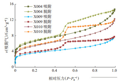 下载eps/tif图 图 4 川南地区五峰组—龙马溪组页岩N2吸附—脱附曲线 Fig. 4 Nitrogen adsorption-desorption curves of WufengLongmaxi Formation shale in southern Sichuan Basin |