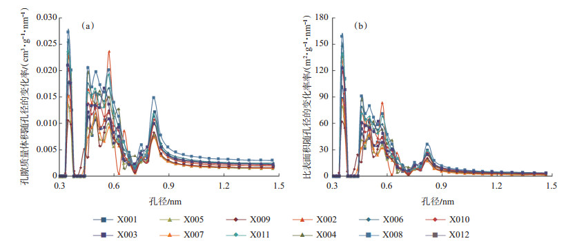 下载eps/tif图 图 6 川南地区五峰组—龙马溪组页岩孔隙质量体积(a)和比表面积(b)随孔径的变化率分布曲线 Fig. 6 Distribution curves of pore mass volume (a) and specific surface area (b) with the pore diameter of Wufeng-Longmaxi Formation shale in southern Sichuan Basin |
