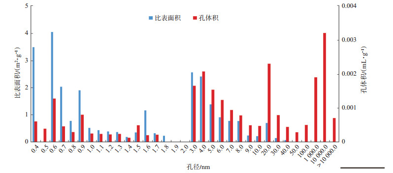 为更加全面地表征页岩孔径分布,对页岩孔隙结构进行全孔径表征,将高压压汞法、N2吸附法和CO2吸附法等3种实验方法相结合,其孔体积和比表面积分布特征如图 7所示,微孔孔径集中在0.5~ 0.6 nm,介孔孔径集中在10~20 nm,宏孔孔径集中在1~10 µm,说明介孔和宏孔提供主要的孔体积。页岩孔隙比表面积主要由微孔提供,小于0.9 nm的孔隙占主导,可能由大量发育的有机孔导致,随孔径增大比表面积整体呈减小趋势,介孔提供少量比表面积。由表 2可知,页岩总孔体积介于0.014 7~ 0.032 2 mL/g,平均为0.024 7 mL/g,总孔隙比表面积介于19.49~40.68 m2/g,平均为29.04 m2/g。其中介孔孔体积约为0.013 5 mL/g,占总孔体积的54.21%,微孔孔体积约为0.006 2 mL/g,占总孔体积的25.37%,而宏孔孔体积为0.005 0 mL/g,占总孔体积的20.42%,表明介孔对页岩孔体积贡献较大,其次为微孔,宏孔贡献率最小。微孔比表面积平均为19.73 m2/g,占总孔隙比表面的67.97%,介孔比表面积平均为9.27 m2/g,占总孔隙比表面积的31.89%,宏孔的比表面积只有0.04 m2/g,占总孔隙比表面积的0.14%,表明微孔对孔隙比表面积贡献较大,介孔次之,宏孔对孔隙比表面积贡献基本可以忽略不计。