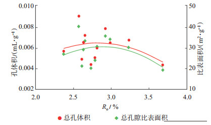 2.6.1 有机质特征川南地区五峰组-龙马溪组页岩总孔体积和比表面积与热演化程度之间关系如图 8所示,可能受页岩矿物成分、含水量等多因素影响,当Ro介于2.0%~3.0%时,有机质进入高温生气阶段,已经生成的液态烃和重质气态烃将发生强烈的裂解作用,甲烷气体膨胀,总孔体积和比表面积明显呈上升趋势。当Ro大于3.0%时,由于有机质裂解阶段和生气阶段基本结束,受温度和压力影响,开始形成固体沥青或石墨等炭化作用产物,堵塞原来已有的孔隙,导致总孔体积和比表面积均随热演化程度的增加呈下降趋势。