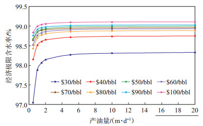 (2) 单井经济极限含水率随油价和日产油量的升高而升高。当油价$30/bbl到$100/bbl时,产油量由0.5 m3/d提高到20.0 m3/d,经济极限含水率从97.05%大幅上升至99.11%。